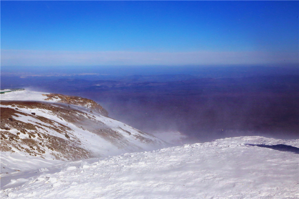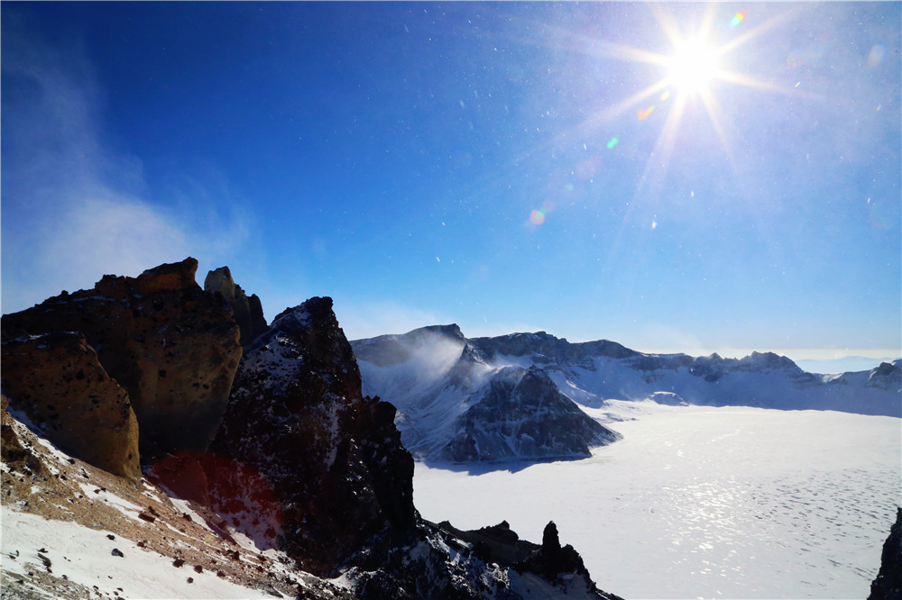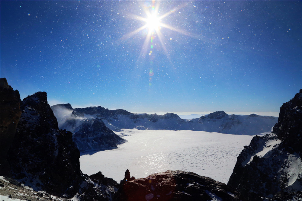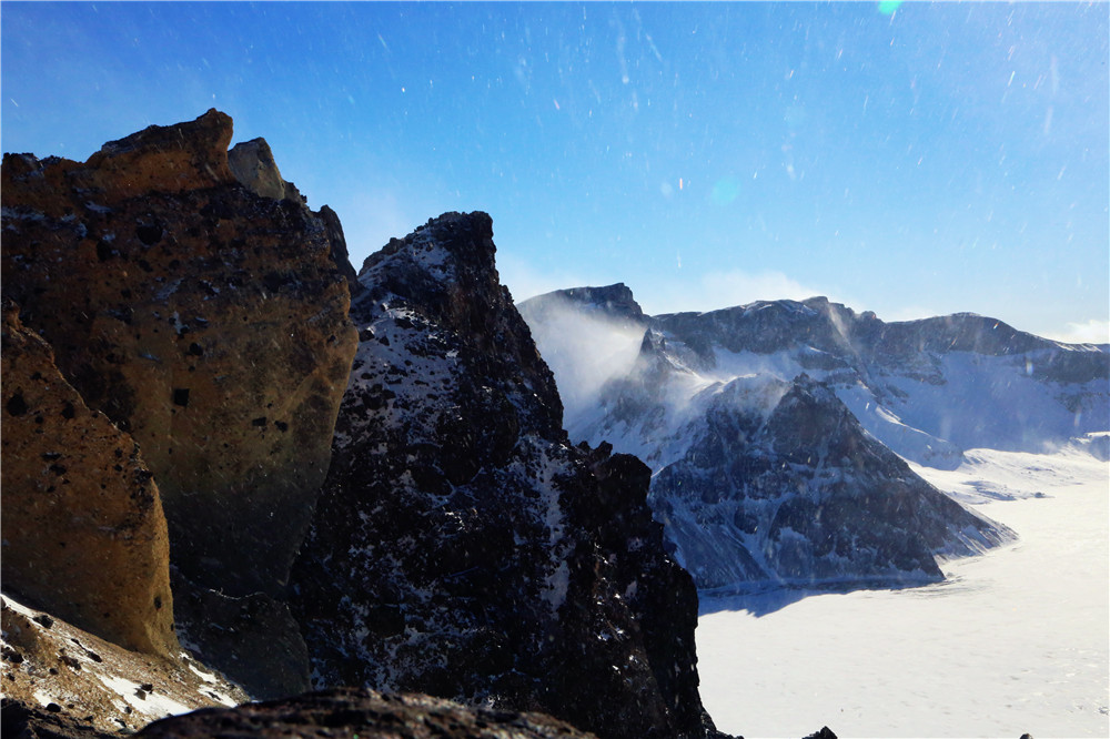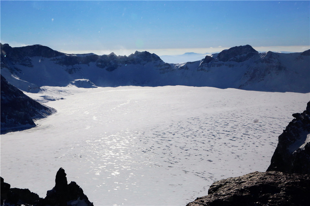 一路盘山终于登顶,此时天公作美云朵散去,终于看到了天池。以前长白山冬季要进入漫长的封山期,最近这几年才开放的,所以第一次一睹冬日天池的面貌,冰天雪地代替了一汪蓝水,四周群山在一片雾气中雄伟霸气,活脱一副水墨山水画。